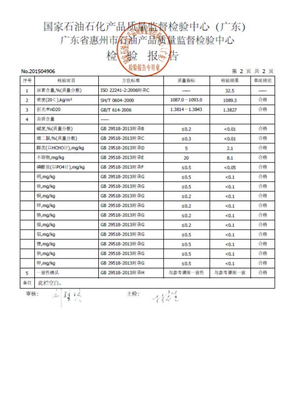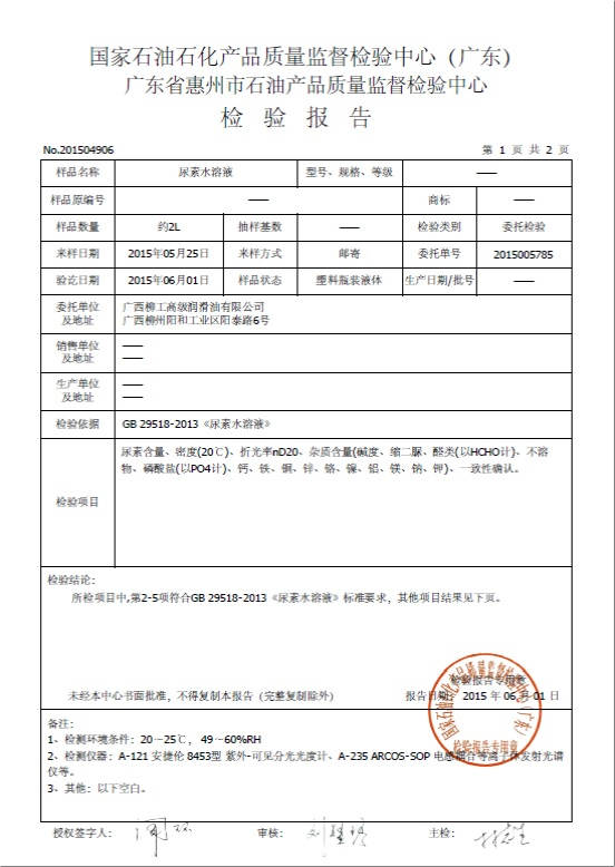 ? ? ? ? 2015年6月1日,我司的“馭藍(lán)柴油尾氣處理液”通過了第三方——國(guó)家石油石化產(chǎn)品質(zhì)量監(jiān)督檢驗(yàn)中心(廣東省惠州市石油產(chǎn)品質(zhì)量監(jiān)督檢驗(yàn)中心)的檢測(cè),其中多個(gè)檢測(cè)項(xiàng)目包括:密度、折光度、堿度、縮二脲含量、醛類指標(biāo)、不溶物含量、磷酸鹽含量,檢測(cè)出來的指標(biāo)都遠(yuǎn)遠(yuǎn)低于國(guó)家規(guī)定標(biāo)準(zhǔn),其他的重金屬鋁、鈣、鉀、鈉、銅、鐵、鎂、鎳、鋅、鉻都均未檢測(cè)出來,就連紅外定性也與標(biāo)準(zhǔn)譜圖一致,相關(guān)技術(shù)指標(biāo)均符合國(guó)家GB 29518-2013《尿素水溶液》的嚴(yán)格標(biāo)準(zhǔn),最后“馭藍(lán)”順利地拿到了合格的檢測(cè)報(bào)告。