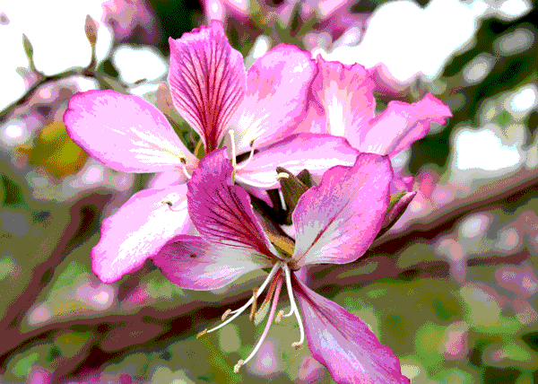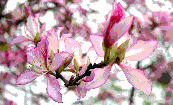 紫荊花的走道,一棵一棵的紫荊花樹,一朵一朵的紫荊花朵,立在走道的兩旁,特別有情趣、浪漫。紫荊花,怒放著,絢麗多彩。